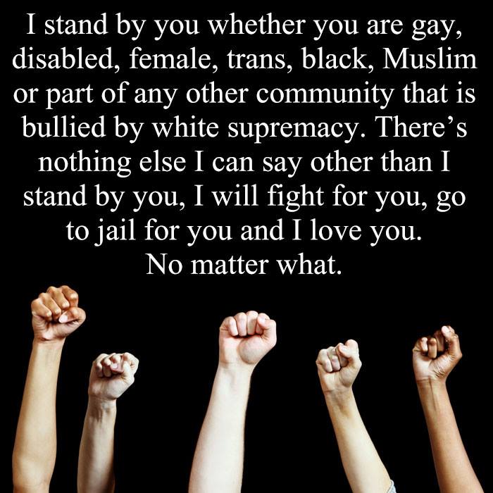 This is not going to be easy. This is going to be struggle. I am prepared for that. If nothing else, I feel like all of my radical organizing, all the anti fascist work, all the anti racist work I have done all of my life has led me to this moment. But I am hurting and I am frightened, and I need some time to process this. In the mean time, white allies, I look to you.