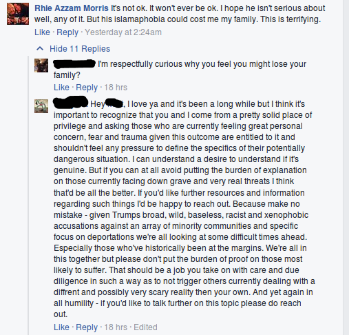 This is a very real reaction to a very real tragedy. If we are going to overcome this, we will have to fight. We cannot do it alone. If ever there was a time for unity and understanding across all intersections, we have come to it. Another old friend of mine, a white male, posted a call to those of us who are mourning. He offered love and support and I took it gratefully. I want you to see this interaction, and I want you to know its value.